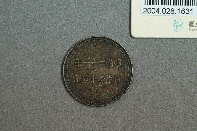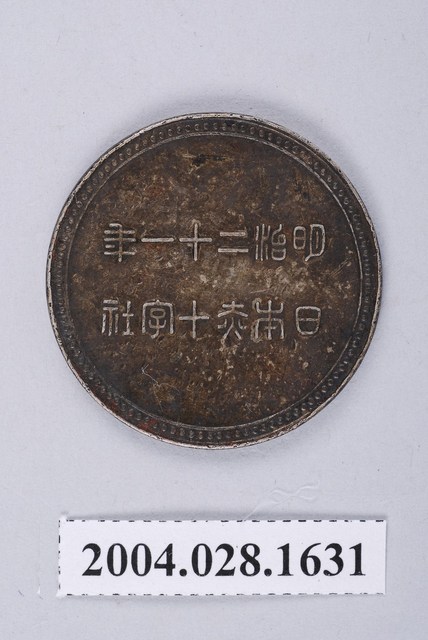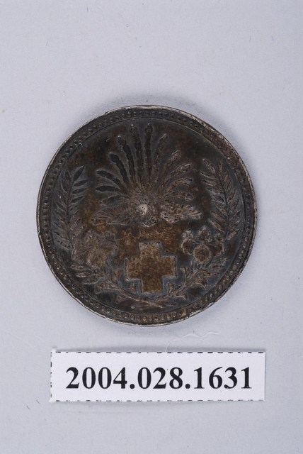 1.本物件為日本赤十字社紀念章。赤十字社即紅十字社。此紀念章為圓型金屬材質,但已難判斷原金屬色澤。正面中間正上方有一隻鳳凰,鳳凰下方有十字標誌,鳳凰與十字兩旁有竹枝葉與花朵,最外圍有點狀物圍成圈。背面有兩行字體,第一行為明治二十一年(1888),第二行為日本赤十字社。
