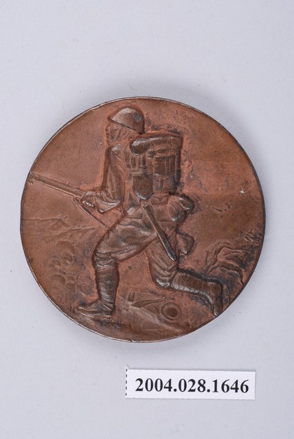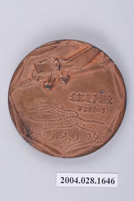 1.本件為昭和12年支那事變紀念章,圓形,金屬製造。正面為1位步兵圖案,背面有軍機圖案和「支那変變記念」、「昭和十二年」字樣。2.1937年7月7日發生中日戰爭,中國稱為「七七事變」或「盧溝橋事變」,日本稱「支那事變」。3.紀念章的製作,是為了表示對某一事件的產生之思念不忘。