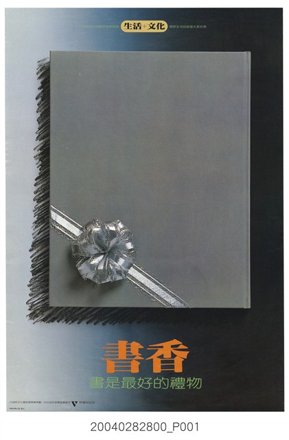1.本件為「書香書是最好的禮物生活文化系列海報」,上緣稍微捲曲,右下角有摺皺,保存狀況佳。2.近上緣處為生活文化系列海報的口號「參與文化活動不分你我他 提升生活品質是大家的事」,中間以書為主角,佔滿篇幅,書為灰白色精裝,邊以黑色流蘇為裝飾,左下角綴以彩帶球花,將書包裝成禮物,用以呼應標題,近下緣才是標題「書香書是最好的禮物」,書香兩字為橘色,後為綠色。左下角有海報資訊。