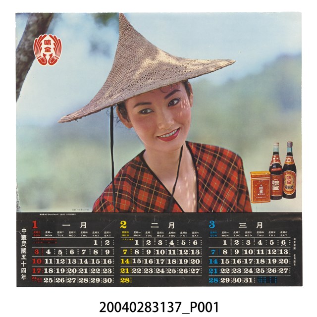1.本文物為1965年味全企業月曆海報,月曆海報底色為黑色,上方為圖片,為張美瑤小姐戴著斗笠微笑的畫面。圖片左上方為味全食品工業股份有限公司的商標,右下方為味全企業的商品。海報為該年1、2、3月之月曆。