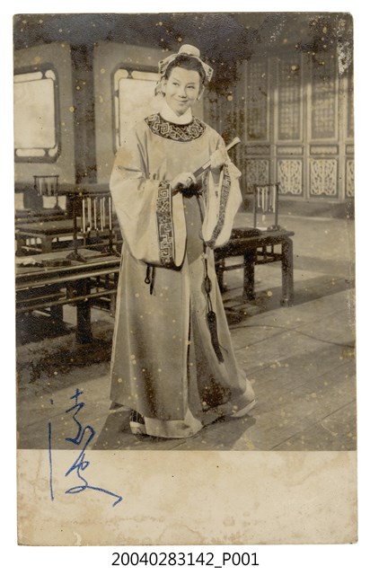 1.香港電影明星凌波演出電影《梁山伯與祝英台》全身黑白劇照明信片,直式雙面,凌波女扮男裝身穿梁山伯戲服,手持紙扇,英姿颯爽,此劇照左下方還有凌波藍色親筆簽名,但此明信片狀況不佳,正反面有大量的受潮,因此密佈許多黃點,邊緣也有些磨損,背面則蓋印「邵氏製片廠贈」。2.香港電影《梁山伯與祝英台》於1963年由香港邵氏出品,李翰祥自編自導,凌波出演梁山伯,樂蒂飾演祝英台,當時凌波女扮男裝的模樣風靡亞太地區,凌波來到臺灣時臺北因此萬人空巷,此部電影全部歌曲皆採用黃梅調演唱,並榮獲第二屆金馬獎。