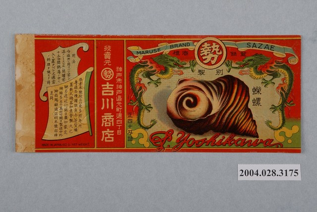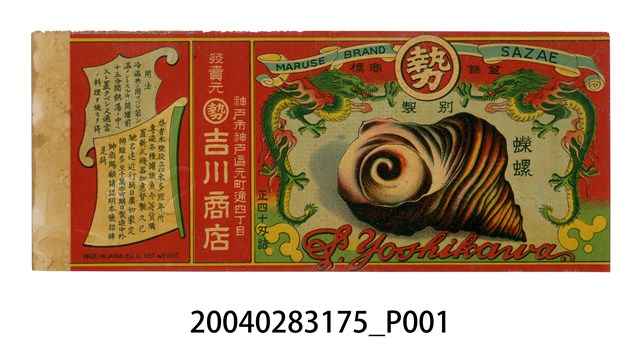 本件吉川商店製蠑螺罐頭商標原本黏貼於罐頭罐身上之紙質印刷品,作單面彩色印刷,呈長22.6公分,寬9.4公分之橫式長方形商標紙。以紅色為底色,另以黃色框條分割成3格長方形版面。左側版面以兩個造型框面疊合而成,分別於框內印有食用方法以及商家說明。續接右側版面則以白色直書「發賣元」,中嵌圓環內帶「勢」字商標,「吉川商店」,「神戶市神戶區原町通四丁目」。右框版面上方作淡藍色飄帶內印「MARUSE BRAND SAZAE」,飄帶中央為紅底白環框,內印「勢」字商標。中央處左右兩側以龍紋裝飾,正中以淡藍色底繪有蠑螺圖案以及「蠑螺」字樣。