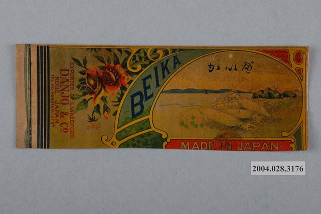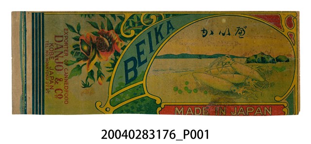 本件DANJO製烏賊罐頭商標原本黏貼於罐頭罐身上之紙質印刷品,作單面彩色印刷,呈長26.9公分,寬9.7公分之橫式長方形商標紙。版面風格以裝飾藝術為主,使用1道由上而下之弧形區線分隔左右畫面,弧線內成框以藍天綠地為背景,上印藍色「BEIKA」字樣。左側版面以以彩繪花朵葉紋為裝飾,另以紅字印刷「DANJO & CO..」「KOBE JAPAN」為外銷出口的罐頭。版面右側則以遠方海洋為背景,近岸處擺放有數隻烏賊。下方底緣處另以紅色為底座長方形框,框內印有「MADE IN JAOAN」
