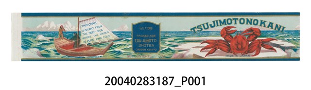 本件JSUJIMOTONO製螃蟹罐頭商標原本黏貼於罐頭罐身上之紙質印刷品,作單面彩色印刷,呈長28.8公分,寬4.9公分之橫式長方形商標紙。以寬闊之海面與天空作為背景,上下兩端各以藍色與金色條框裝飾。版面右側上端印有藍色「TSUJIMOTONOKANI」,中央處於岩岸上繪有肥美碩大之單隻紅色螃蟹,下端印有「MADE IN JAPAN」。版面中段以金色邊深藍色底作頂緣弧線兩端翹起之方形框,框內印有「PACKED FOR TSUJIMOTONO SHOTEN CHOSEN KEIJYO」。版面左側則會有單桅木帆船,2人於船內工作之景象,白色帆布上印有罐頭製作之螃蟹出處。