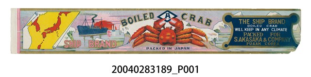 本件船牌螃蟹罐頭商標原本黏貼於罐頭罐身上之紙質印刷品,作單面彩色印刷,呈長33.6公分,寬5.4公分之橫式長方形商標紙。以浮有冰山之海面為背景,上下兩端以金色條框裝飾。版面右側中央處以金色邊條作深藍色底色,外型呈橫式長方形框,期短邊作內凹弧線,4端角各以圓形裝飾,內印金色「THE SHIP BRAND」「PACKED FOR S.AKASAKA & COMPANY」、「FUSAN COREA」字樣。版面中段上端以藍色方菱形邊白底框內印「H」字樣為商標,左右兩側印有「BOILED CRAB」,中央處於冰山上繪有肥美碩大之單隻紅色螃蟹,下接「MADE IN JAPAN」。版面左側背景遠方繪有半圓紅色太陽,海面有小艘帆船與大艘郵輪航行,底緣處印有粉紅色「THE SHIP BRAND」,左側以不規則五角形框內印黃色底面,以紅色標示日本範圍之地圖。。