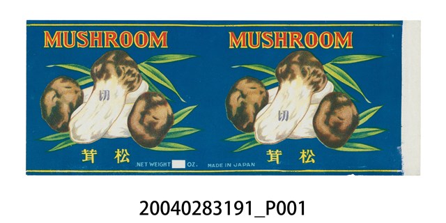 本件切松茸罐頭商標原本黏貼於罐頭罐身上之紙質印刷品,作單面彩色印刷,呈長23.9公分,寬9.4公分之橫式長方形商標紙。底色為藍色,上下端以黃色邊條框裝飾,版面左右側皆作相同圖案設計,上端以紅底黃邊字體印有「MUSHROOM」字樣,中央處繪有3朵交疊擺放的松茸,並以綠色竹葉襯底,於蕈柄上印有深灰色「切」字樣。下端則印有黃色「松茸」字樣。版面中段處底緣則印有淡藍色「MADE IN JAPAN」。