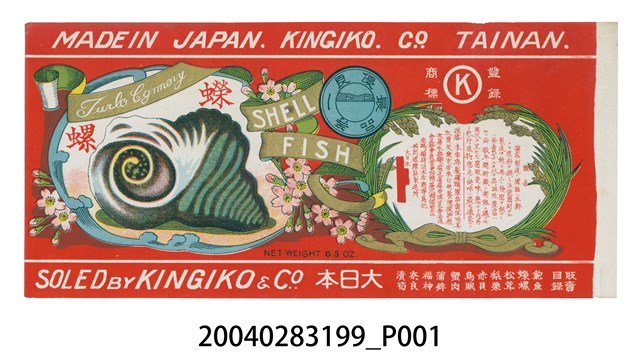 本件KINGIKO製蠑螺罐頭商標原本黏貼於罐頭罐身上之紙質印刷品,作單面彩色印刷,呈長23.2公分,寬10.8公分之橫式長方形商標紙。以紅色為底色,上下端以白線條作框,框外上端印有「MADE IN JAPAN」、「KINGIKO. CO. TAINAN」,下端為「大日本」、「SOLED BY KINGIKO & CO.」字樣,以及產品目錄。版面右側上端處以白色圓環形框白色方菱形框,框內印有「K」為登錄商標,左側印有圓形獎牌,為最優良一等品。中央處以左右側各以稻穗圍繞成框,框內印有商品特色與商家說明,商家屬名處以紅色塊刻意塗銷。版面左側以藍色海浪紋作橢圓形框,框內繪有碩大的單顆蠑螺,上端印有紅色「蠑螺」字樣。框外裝飾有櫻花花卉並以黃色飄帶纏繞,飄帶上印有「SHELL FISH」字樣。