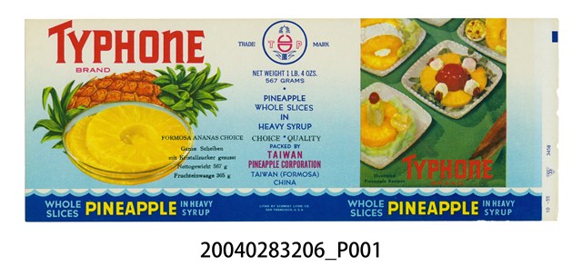 本件台鳳製鳳梨罐頭商標原本黏貼於罐頭罐身上之紙質印刷品,作單面彩色印刷,呈長28公分,寬10.7公分之橫式長方形商標紙。商標紙上半部3分之2版面以藍白漸層色為主,下端則採深藍色裝飾,其交界處另以淡藍色作半圓連續紋呈波浪型紋飾。版面下端左右側皆印有糖漬鳳梨輪狀切片之英文字樣。版面右側以照片作為視覺圖案,其內容以鳳梨片作各式擺盤裝飾並以綠色桌布襯底,右下端則印有紅色「TYPHONE BRAND」字樣。版面中段處上端以藍色圓環框內印有「台」字樣作鳳梨造型,左右兩側為「TP」,下端帶有「鳳」字樣為商標,下端註明為糖漬鳳梨輪狀切片與「PACKED BY TAIWAN PINEAPPLE CORPORATION」、「TAIWAN (FORMOSA) CHINA」字樣。版面左側上端同樣作紅色品牌名,中央處繪有以透明玻璃碗裝盛的鳳梨片,其背景以整顆帶皮鳳梨作襯。