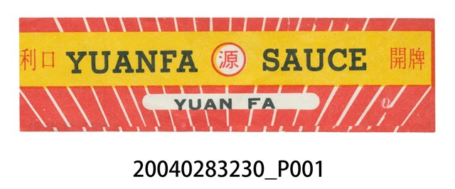 本件源發醬油製利口開牌醬油商標原本黏貼於醬油瓶身上之紙質印刷品,作單面彩色印刷,呈長11公分,寬3公分之橫式長方形商標紙。商標紙印刷略有不正,以紅色為底色,並以白色直線,由下端朝上作散射狀,底端線條略有錯印。版面中段處偏上端印有黃色帶狀底框,中央處印有白底圓環紅框,內帶「源」字樣,左右兩側印有黑字「YUANFA SAUCE」與紅字「利口開牌」字樣,帶狀下方作白色橫式長橢圓形框底,內印「YUAN FA」黑色字樣。