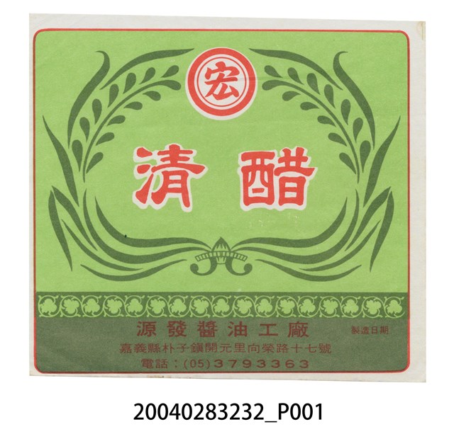 本文物為源發醬油工廠製清醋的包裝標籤,正方形標籤,底色用兩個色塊分隔內容,上半部註明產品「清醋」,正上方圓形「宏」字商標;下半部寫有製造工廠名稱、地址及電話。