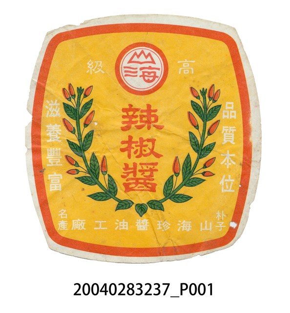 本文物為山海珍醬油工廠製高級辣椒醬的包裝標籤,四邊形標籤,印有圓形「山海」圖像化字樣的商標、商品名稱、製造工廠名稱,並印有「品質本位」、「滋養豐富」、「朴子名產」等廣告字樣,吸引消費者的購買。