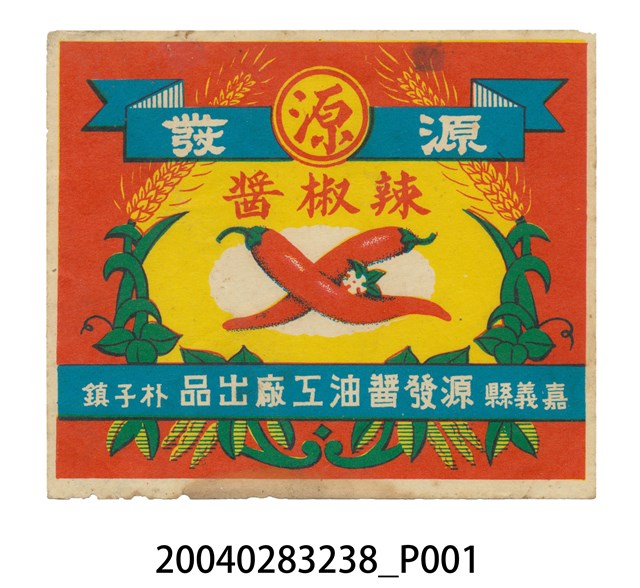 本件源發醬油工廠製辣椒醬商標原本黏貼於玻璃瓶瓶身上之紙質印刷品,作單面彩色印刷,呈長10.7公分,寬9.2公分之近正方形商標紙。商標紙以紅色為底色,版面中央處左右側以麥穗包圍成框,下方則作豆莢植物裝飾。框內以黃色為底色,中心處以2條紅色辣椒作X形擺放,背襯橫式長橢圓形白底,上端印有紅色「辣椒醬」字樣。版面上端以藍色飄帶作框,中央處印有雙環型黃底紅框,內帶「源」字樣為商標,左右兩側印白字「源發」。版面下端橫式藍色帶框,框內印有白色「嘉義縣朴子鎮源發醬油工廠出品」字樣。