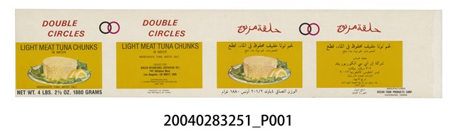 本件雙環牌水煮鮪魚罐頭商標原本黏貼於罐頭罐身上之紙質印刷品,作單面彩色印刷,呈長51.1公分,寬10.6公分之橫式長方形商標紙。商標紙以白色為底色,於版面上作4個等距排列的黃色長方形底框,以兩個底框為一組,其版面設計皆為相同,左側以英文為主,右側則以阿拉伯文字為主。長方形框上端印紅字「DOUBLE CIRCLS」,兩側之間帶有紅色與黑色之略為疊合圓環形為商標。框內上端印黑字「LIGHT MEAT TUNA CHUNKS 」。左側框內中央處以圓盤裝盛有水煮鮪魚塊之實物商品照為主視覺。右側框內則以黑字印有分銷商名稱、罐頭成分與製造地點。