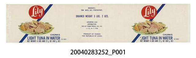 本件Lily牌水煮鮪魚罐頭商標原本黏貼於罐頭罐身上之紙質印刷品,作單面彩色印刷,呈長51.2公分,寬10.7公分之橫式長方形商標紙。商標紙以白色為底色,左右版面皆作相同設計,其背景以深藍色粗線條作左下斜切設計,上端以紅色圓底框,內印白色「Lily」字樣為品牌名稱,中央處以白色圓盤底襯綠色生菜,並裝盛塊狀水煮鮪魚之實品照片為主視覺,下端則以藍色印有「CHUNKS LIGHT TUNA IN WATER」與罐頭重量。版面中段處以藍色字體印有罐頭成分、分銷商名稱與製造地為臺灣的英文資訊。