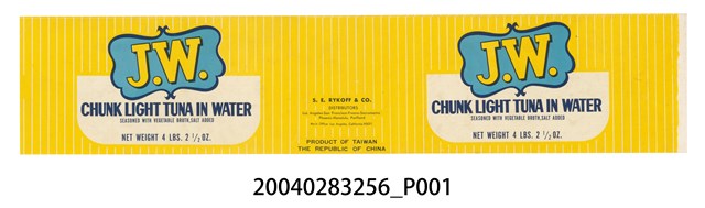 本件J.W.牌水煮鮪魚罐頭商標原本黏貼於罐頭罐身上之紙質印刷品,作單面彩色印刷,呈長51.6公分,寬10.7公分之橫式長方形商標紙。商標紙以黃色為底色,表面帶有垂直等距之白線條裝飾。左右版面皆作相同設計,上端為蝴蝶形淺藍底深藍框,內以黃色印有「J. W.」為商標名稱。下端以剖半之橫式長橢圓形白底框,內印藍色「CHUNK LIGHT TUNA IN WATER」為商品名稱,底緣則帶有罐頭重量。版面中段處下半部標示有分銷商名稱與製造地為臺灣之英文資訊。