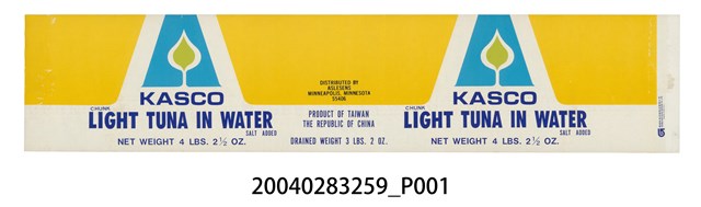 本件KASCO牌水煮鮪魚罐頭商標原本黏貼於罐頭罐身上之紙質印刷品,作單面彩色印刷,呈長51公分,寬10.7公分之橫式長方形商標紙。商標紙上端3分之2畫面以黃色為底色,下端則作白色。左右版面皆作相同設計,上端作上窄下寬之寬厚的藍底白色梯形框,框內又作直立白框綠底之單葉葉片,下端印深藍色「KASCO」為商標。下端底緣則印有「LIGHT TUNA IN WATER」商品名稱與罐頭重量。版面中段處標示有分銷商名稱與製造地為臺灣的英文字樣。