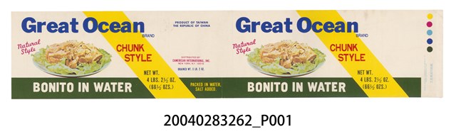 本件GREAT OCEAN牌水煮鰹魚罐頭商標原本黏貼於罐頭罐身上之紙質印刷品,作單面彩色印刷,呈長51.6公分,寬10.6公分之橫式長方形商標紙。商標紙版面左右側皆作相同設計,背景以白色為底色,下端作深綠色帶狀,版面偏右處作右斜下之黃色帶框。版面上端以藍色印「GREAT OCEAN」品牌名稱,中央處以白色圓盤內襯綠色生菜,裝盛有水煮鰹魚塊之實品照為主視覺,右側以紅字印「CHUNK STYLE」與罐頭重量,下端底緣處為白字「BONITO IN WATER」。版面中段處標註有分銷商名稱與製造地為臺灣之英文資訊。