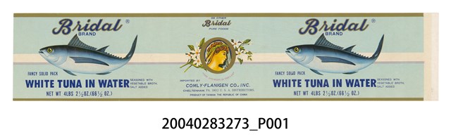 本件Bridal牌水煮鮪魚罐頭商標原本黏貼於罐頭罐身上之紙質印刷品,作單面彩色印刷,呈長51.5公分,寬10.7公分之橫式長方形商標紙。商標紙以淡藍色為底色,上下端以金色邊條作框線,,中段處以橫式白色寬線裝飾,版面左右兩側皆作相同設計。上端以金邊藍底字體印「Bridal」品牌名稱,中央處繪有單條鮪魚圖像作主視覺,下端則印有「WHITE TUNA IN WATER」商品名稱與罐頭重量。版面中段處印有金色圓環框,框外裝飾花卉,框內繪有西洋女性頭像作商標,下端則標示有公司名稱與製造地為臺灣之英文資訊。