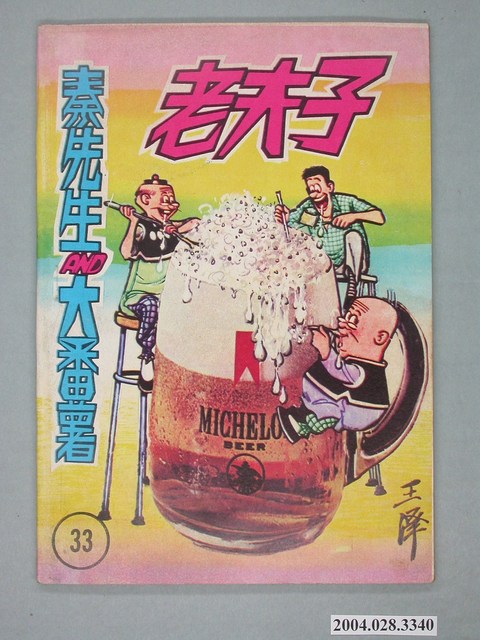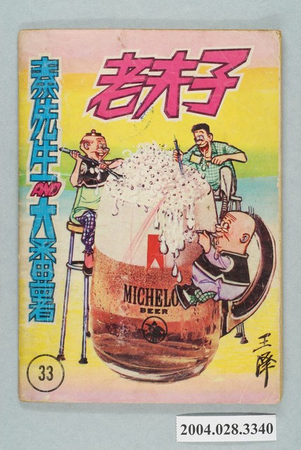本件漫畫《老夫子》33集的封面是一杯大杯啤酒,老夫子、秦先生、大蕃薯三人圍在酒杯旁,用不同的食器享用著啤酒,上方橫書「老夫子」,左側直書「秦先生and大蕃薯」,左下方黑色圓圈內有「33」,右下方有作者「王澤」2字,保存完整。
