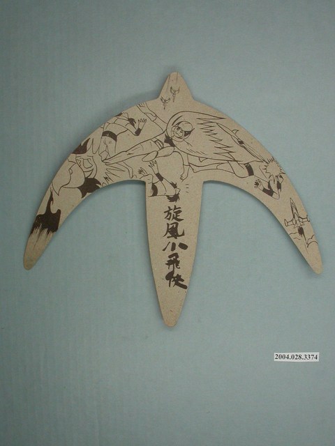 1.本物件為童玩旋風小飛俠,為飛機形狀紙卡,正面中央為珍珍戴著頭盔張開雙臂飛翔的圖案,中間為紅色、兩翼為藍色並帶有綠色及紅色花紋。背面為旋風小飛俠打鬥圖,整體僅有單一的黑色,中見下方有「旋風小飛俠」字樣。