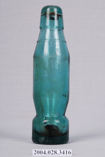 1.此件彈珠汽水瓶由青藍色玻璃製成,玻璃厚實,顏色清透,整體呈瘦長圓柱形,長約5.2公分,寬約5.1公分,高約19公分,瓶身有一道明顯刮痕。外型由瓶口開始向下漸寬,中段為直筒狀最寬,中段以下內縮又向外,並直筒到底,呈一穩固座台形體。2.彈珠汽水是日治至戰後時期十分流行的飲品之一,飲用時,需用凸字形工具於瓶口用力一拍,將瓶口的玻璃彈珠打進瓶內,便可引用清涼的汽水。飲用完畢後,瓶內的彈珠可取出,成為當時兒童間普遍的收藏品。