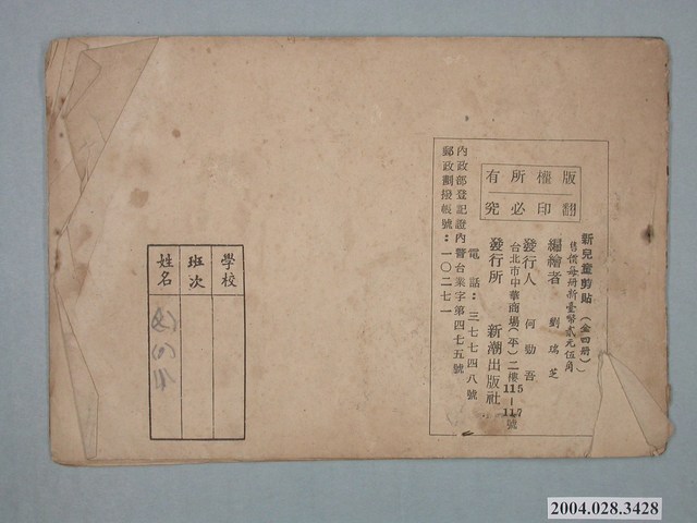 1.臺灣出版新兒童剪貼(全四冊)在臺發行中文彩色剪貼簿,橫式雙面,全部四冊,此為第四冊,正面為全彩,底色為黃色,一男一女小朋友正在書桌前面做剪貼,背景有綠紅色小人剪影於左上方串連在一起,下方桌面則有兩張圖,右邊那張是蝴蝶,左邊為註記「新潮出版社發行」,背面則是出版資訊位於右下角,有「內政部登記證內警台業字第四七五號」字樣,左邊則可撰寫學校班級與姓名,姓名處有鉛筆痕跡,右邊圖書資訊則註記此冊售價為新台幣貳元伍角,發行人為何勁吾。正面邊緣較為磨損老舊,背面狀況比較糟,左側邊緣明顯好幾張紙折起,右邊則有撕裂,整體泛黃。2.新兒童剪接共有四冊,發行時期約1968年-1970年,發行人為何勁吾,何勁吾來台後致力投資兒童相關事業,發行單位為新潮出版社。