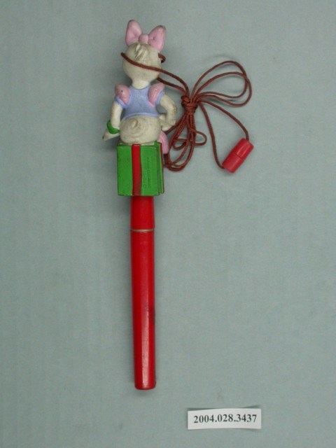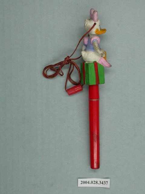 1.本文物為塑膠筆套,外形為迪士尼卡通黛絲鴨,該文物使用方式為套在筆桿一端,作為裝飾及平衡之用背後可見版權符號與文字© 「DISNEY SUNKISSED HAWAII」商標的浮雕字體。2.華特迪士尼公司(The Walt Disney Company)設立於1923年,初期名稱為「迪士尼兄弟卡通工作室」,該工作室主要以發展電影動畫製作為主,後期亦開始著手電視、主題公園等多角化經營。
