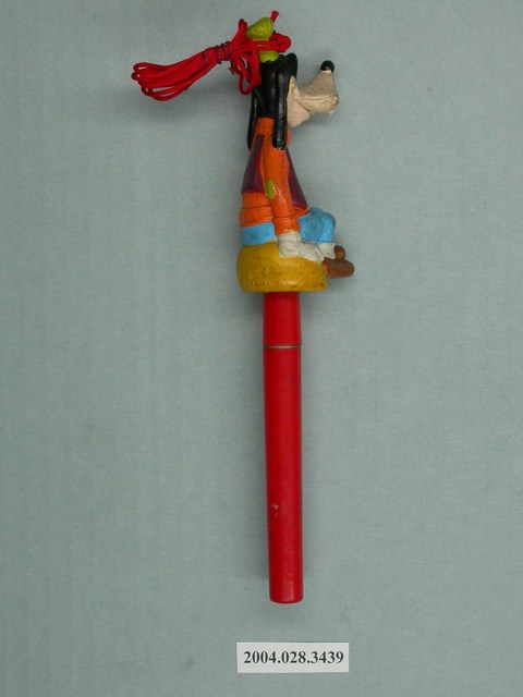1.本文物為塑膠筆套,外形為迪士尼卡通高飛狗Goofy,該文物使用方式為套在筆桿一端,作為裝飾及平衡之用背後可見版權符號與文字© 「DISNEY SUNKISSED HAWAII」商標的浮雕字體。2.華特迪士尼公司(The Walt Disney Company)設立於1923年,初期名稱為「迪士尼兄弟卡通工作室」,該工作室主要以發展電影動畫製作為主,後期亦開始著手電視、主題公園等多角化經營。