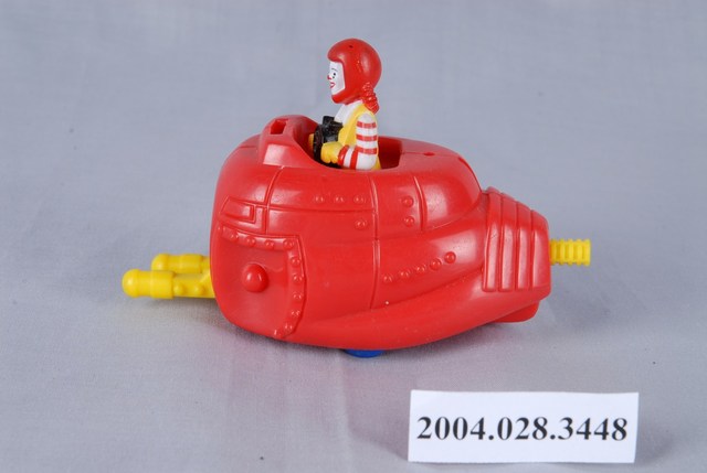 1.本物件為速食餐廳麥當勞玩具,塑膠材質。該物件乃麥當勞叔叔正在駕車之塑膠玩具,主要配色為紅、黃、藍、白色。該玩具車前方可見藍色面板、黃色柱狀物體。