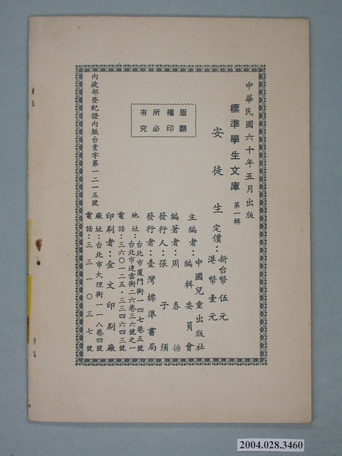 本件《安徒生》是學生標準文庫第一輯作品,周春搪編著,民國60年由臺灣標準書局發行。
