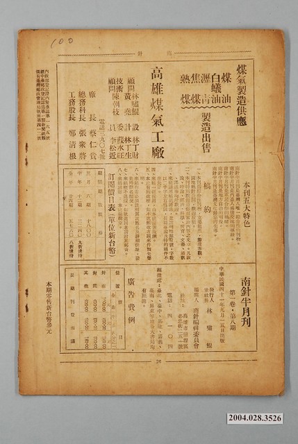 此為一紙質雜誌,此書為南針雜誌社於1952年(民國41年)9月15日發行的《南針》半月刊第1卷第8期。 本書《南針》半月刊書籍,為林嘯鯤於1952年創辦,在每一期後,便標榜《南針》半月刊的辦誌主要特色,其中包含「臺灣人唯一綜合性的刊物」、「內臺人感情交流的樞紐」、「軍民合作的橋梁」、「地方自治的明燈」、「臺灣文化歸宗的先導」,由此可見《南針》的主要特色為再建構二二八事件以來內外省人、軍隊及人民之間的橋梁,並倡導地方自治及漢文化。而本誌的創辦人林嘯鯤為臺籍人士,並曾經參加中華民國政府派出協助接收臺灣的臺灣調查會,另也曾創作創作詩集。 在戰後初期,出版法規的鬆綁促使臺灣的雜誌大量創辦,然而1946年行政長官公署下令禁止使用日文,使雜誌受到語文限制的打擊,更於1947年發生二二八事件,大量的雜誌遭到查禁,其後僅有官方雜誌以及受到官方贊助的雜誌得以存活,物價的飆漲更進一步限制雜誌的生存。在1949年戒嚴之後,言論自由受到限制,民間雜誌更受到影響,知識分子僅能從文藝、人文思想方面尋找出口,形成1950至1960年代文藝雜誌大量出現的狀況。