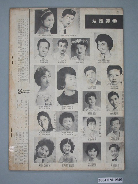 1。本文物為國際電影雜誌第77期,出版者為國際電影畫報社,為民國五十一年三月號。封面上方印「暢銷全世界報導中國電影動態最具權威性的唯一定期刊物.第七十七期.三月號」、「國際電影」、「INTERATIONAL Screen」。左下角印「三月號」、「77」、「MARCH」。封面人物為留著俏麗短髮,頭戴紅色畫家帽,著紅色上衣,面露徵笑的女子,為演員白露明。目錄頁左半部為夷光小姐全身照,其著半長袖上衣,腰繫豹紋腰帶,長色長褲,雙手置於大腿微蹲。右半部為目錄,包含「清麗如畫的丁皓小姐(宗惟賡攝)」、「葉楓小姐(宗惟賡攝)」、「雷震談演古裝片」等38則報導。版權頁左部為版權相關資訊,右部則為幸運讀者之照片,計20人。