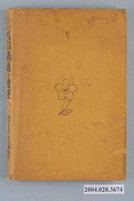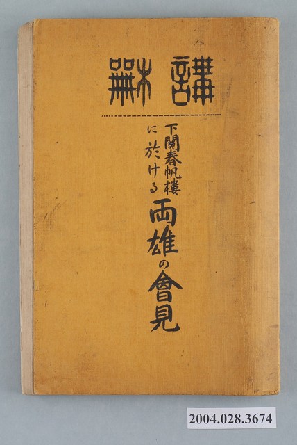 此為一紙質書籍,此書為大園市藏編譯、「明治史蹟研究會」於1925年(大正14年)出版的《下關春帆樓に於ける兩雄の會見》。 此書《下關春帆樓に於ける兩雄の會見》(兩雄於下關春帆樓會見)為明治史蹟研究會於1925年出版的歷史書籍,此書講述的內容為甲午戰爭結束後,清廷代表李鴻章與日本代表伊藤博文在日本下關地區的春帆樓中談判的相關過程,而該地也被稱為「馬關」,是故一般稱此次和談條約為「馬關條約」,該書十分詳細地論述該次和談中的五次會議、李鴻章遇刺經過、雙方對於此次會議的盤算,及條約的後續效應。 在1894年中國清朝與日本因為朝鮮的內部動亂「東學黨事件」而引發日清兩國開戰,是為「甲午戰爭」,後在該年年底清軍大敗,因而在1895年2月派出北洋大臣李鴻章與日本總理大臣伊藤博文、外務大臣陸奧宗光等人談判、簽訂條約,條約中清廷答應承認朝鮮獨立、割讓遼東半島與臺灣全島及附屬島嶼、賠償日本兩億兩。但俄、德、法三國因不願喪失東亞利益以及外交等種種因素,因而干涉條約導致日本答應清廷付款贖回遼東半島,此次和約後,日本獲得臺灣,以及在1910年吞併朝鮮。