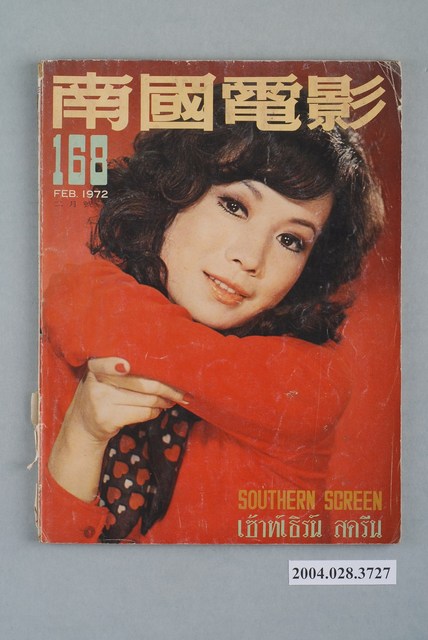 1.本文物為南國電影雜誌第168期,出版者為南國電影畫報社,出版日期為民國六十一年二月。封面上方印「南國電影」、「168」、「FEB. 1972「、「二月號」,下方印「(泰文)」、「SOUTHERN SCREEN」。封面人物為演員井莉,一頭俏麗短髮,穿著紅色絲養襯衫,繫黑底愛心絲巾,左手後拉過右肩,右手輕扶左手肘。背面為柯達相機之宣傳廣告。內容有「凌波」、「李菁」、「何莉莉」、「李麗麗」、「狄龍大鬧快活林」、「宗華葉靈芝喜締良緣」等42則報導。目錄頁前一頁為法國「羅莎」香水之宣傳廣告。版權頁左方為筆友欄,右方為版權相關資訊,附有戶名為「南國電影」之郵政劃撥單。封底為電影「仙女下凡」之宣傳廣告。