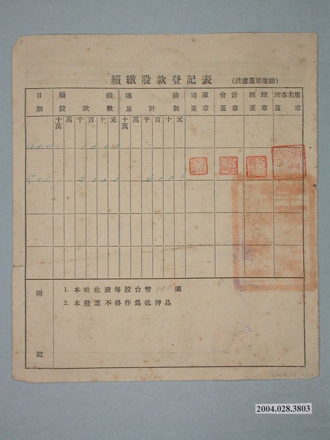 1.本物件為朱福生持有臺北市第十信用合作社股票,為紙質,正面記載內容包括認購股者為朱福生,購買臺北市第十信用合作社股票,購買日期為民國36年(1947)3月21日,購買4股,共4,000元臺幣,物件核蓋完成日為民國37年(1948)5月4日;背面為續繳股款登記表,共有「日期」、「續繳股款數」、「連期累計數」、「司庫蓋章」、「會計蓋章」、「經理蓋章」及「理事主席蓋章」7格,前2行已進行填寫登記。