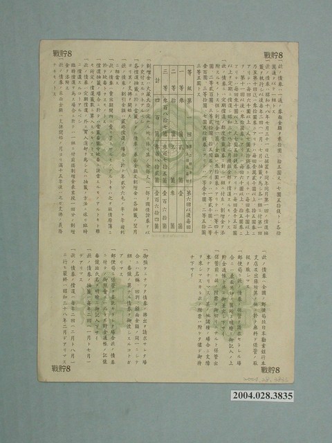 1.本物件為株式會社日本勸業銀行發行割增金附戰時貯蓄債券,為紙質,可分為貯蓄債券、證券保管證與證券保管請求書3部份,正面右上、右下、左上及中下皆有「戰貯8」黑色字樣,貯蓄債券紀載內容包括類型為割增金附戰時貯蓄債券,為第8回105組,編號為067018,金額為7圓50錢,於昭和18年(1944)4月由株式會社日本勸業銀行發行,並於貯蓄債券下方蓋有2個紅色圓印,右者內有1座山之圖案與「大東亞戰爭」字樣,左者則為總裁章;右下與左下分別為證券保管證與證券保管請求書,兩者資料與貯續債券相同,惟皆須填寫貯金通帳紀錄番號,及持有人姓名,另分別需蓋保管日附印及受附日附印。背面為紀載此張貯蓄債券之法規與悉知,並有表格介紹不同等級不同回數之金額差別,背面4個角落皆有「戰貯8」黑色字樣。