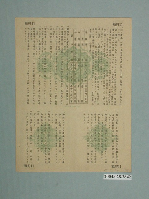 1.本物件為株式會社日本勸業銀行發行割增金附戰時貯蓄債券,為紙質,可分為貯蓄債券、證券保管證與證券保管請求書3部份,正面右上、右下、左上及中下皆有「戰貯11」黑色字樣,貯蓄債券紀載內容包括類型為割增金附戰時貯蓄債券,為第11回17組,編號為055646,金額為15圓,於昭和18年(1944)10月由株式會社日本勸業銀行發行,並於貯蓄債券下方蓋有2個紅色圓印,右者內有1座山之圖案與「大東亞戰爭」字樣,左者則為總裁章;右下與左下分別為證券保管證與證券保管請求書,兩者資料與貯續債券相同,惟皆須填寫貯金通帳紀錄番號,及持有人姓名,另分別需蓋保管日附印及受附日附印。背面為紀載此張貯蓄債券之法規與悉知,並有表格介紹不同等級不同回數之金額差別,背面4個角落皆有「戰貯11」黑色字樣。