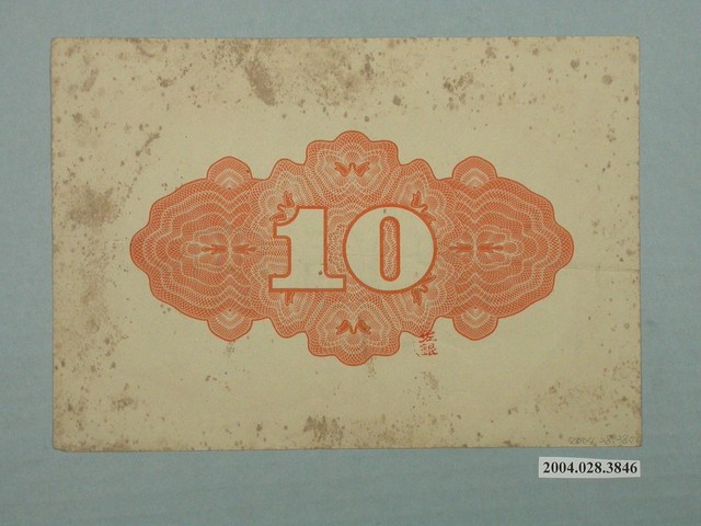 本物件為大日本帝國政府發行大東亞戰爭割引國庫債券拾圓券,為紙質,有花紋邊框圍繞正面四周,並其右上、左上有「10」字樣,右下、左下有「拾」字樣,內容包括物件類型為大東亞戰爭割引國庫債券,為第2回,編號為0838308,金額為10圓,於昭和17年(1942)4月23日由大日本帝國政府發行,發行價格為7圓,償還期日為昭和27年(1952)6月9日,另有大致敘述債券規範條例,並於債券下方蓋有紅色圓印,內有「大藏大臣」字樣,並有船艦與戰車黑白圖案;背面為1只花紋圖案,內有「10」字樣,其圖案旁有橢圓紅印,內有「佐銀」字樣。