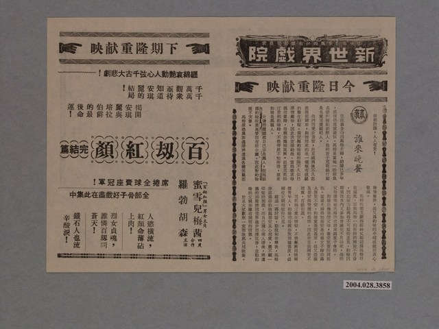 電影本事《誰來晚餐》單張橫幅雙面黑色印刷,外觀保存尚可。又名:猜猜誰來吃晚餐、男生女生黑白配、誰敢來晚餐、猜一猜誰來赴晚宴。電影由斯賓塞屈塞Spencer Tracy、西德尼波蒂埃Sidney Poitier主演,導演斯坦利克雷默Stanley Kramer,1967年上映,新世界戲院印製。右側有「保密防諜 人人有責」。左側為《百劫紅顏》完結篇電影宣傳。背面亦為《百劫紅顏》Angelica eil gran sultano/Indomptable Angélique完結篇電影宣傳,電影由 蜜雪兒梅茜M