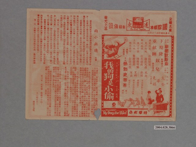 此物件是單張兩面,外觀保存良好,無破損情形,但物件因老舊圖片顏色有變淡的情形。也有些許污漬,影響觀看的情形。 物件主要是《兩小無猜》本事,此《兩小無猜》本事是英國教育部和教會協助攝製兒童音樂教育影片,故事的主題是描寫父母、學校、社會忽視兒童心理狀態而造成隔閡的矛盾。故事是講述在同一間學校兩個男生和一個女生在學校發生的戀愛故事,同時因為對婚姻的不了解,在同學的簇擁之下原本要結婚的男女同學,在校長和家長知悉後趕到才阻止了婚禮的故事。同一面的右半部是遠東戲院中華民國60年7月16日《我的狗是小偷》電影宣傳單。是