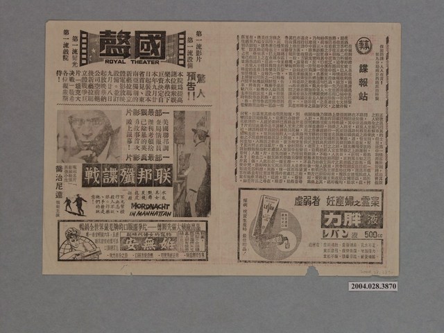 此物件是單張兩面,外觀保存良好,有輕微破損情形,物件也因老舊圖片顏色有變淡的情形。 物件主要是《諜報站》本事,此《諜報站》本事是由第九分局南京西路派出所製,故事是在描述兩名科學家從俄國潛逃至巴黎,美國中央情報局已查悉此二位科學家已經盜得俄國秘密文件,俄方正極力追回。其中過程詭譎多變,究竟過程有何變化?參與其中人的生死是如何?結局會如何?都請繼續觀賞本片。同一面的下方有一則廣告是「探病、祝賀生產時最佳贈品」。虛弱者妊產婦之靈藥,「力胖液」。同一面的左半部是國聲戲院《聯邦殲諜戰》電影宣傳單,是一部最狠影片,美