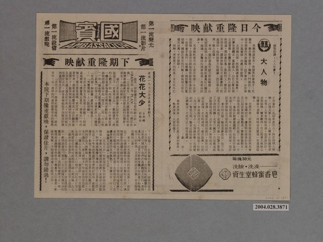 此物件是單張兩面,外觀保存良好,無破損情形,但物件因老舊圖片顏色有變淡的情形。 物件主要是《大人物》本事,此《大人物》本事是在描述西德的漢堡市有一個社會鬼才史提夫,精於電子原理,能夠信守開啟任何保險箱。但不幸在一次作案中,失風被捕被判處三年徒刑,刑滿後回家與嬌妻重逢,無奈又被黑社會盯上,幸好有一好友馬可拔刀相助,但馬可卻與愛妻墮入情網,最後史提夫使計想陷害馬可,卻反而使自己陷入再次坐牢終身監禁的命運。最後史提夫開槍射擊馬可,馬可應聲倒地,史提夫也知道自己已難逃法網的悲慘故事。在物件同一面的下方有一則「每塊