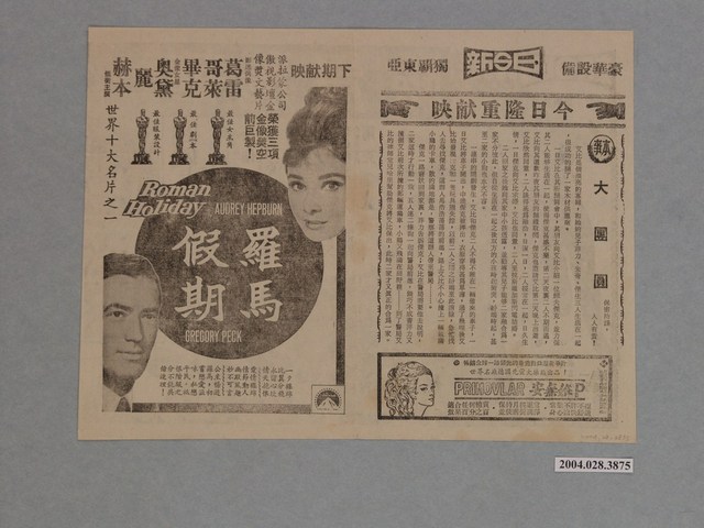 此物件是單張兩面,外觀保存良好,無破損情形,但物件因老舊圖片顏色有變淡的情形。 物件主要是《大團圓》本事,此日新戲院今日隆重獻映的《大團圓》本事是在描述一個漂亮的寡婦艾比和3個小孩一起生活,並且成功開了一家木材供應廠。後來艾比認識了傑克並與傑克結婚,發生在婚後一連串好笑的事,在雞飛狗跳之後艾比和3個小孩和傑克終於成為了一家人的故事。在《大團圓》本事下方有一則廣告是PRIMOVLAR(安無妊P)暢銷全球一路領先的最完美口服避孕片的廣告。世界名廠德國先靈大藥廠出品。物件同一面的左半部是《羅馬假期》電影宣傳單,