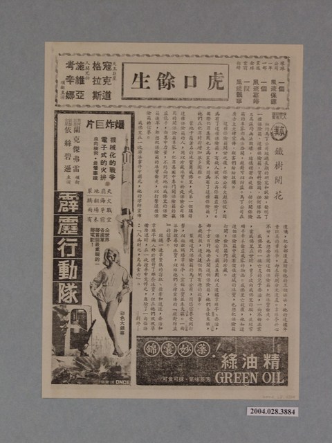 此物件是單張兩面,外觀保存良好,無破損情形,但物件因老舊圖片顏色有變淡的情形。 物件主要是《鐵樹開花》本事,此《鐵樹開花》本事是在描述紐約馬丁公司經過長期的研究和試驗,發明了一種保險箱,這種保險箱質料堅固,結構精密而複雜,任何開保險的人都無法開啟,堅稱絕對可以防盜。在馬丁公司廣泛的宣傳下,顧客紛紛訂購,也因為如此為了可以防盜的保險箱而展開一連串的竊取、搶奪和追逐下,雖然最後終於達成心願獲得珍貴的珠寶,但在一次車禍中卻喪生,應證了「人為財死,鳥為食亡」的故事。在《鐵樹開花》本事上方《虎口餘生》電影宣傳單,是