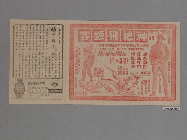 此物件是單張兩面,外觀保存良好,無破損情形,但物件因老舊圖片顏色有變淡的情形。 物件主要是《大浪子》本事,此《大浪子》本事是在描述一位叫羅拔蒙迪的故事,羅拔蒙迪在十九歲就是一個英俊的少年,很得女孩的歡心,到處找工作,有在汽車代銷處工作,也曾擔任製衣工廠的經理,後來又進一家直昇機工廠工作。原本與妻子依蕾娜感情不好,但後來依蕾娜立志入校讀書,反而羅拔覺得依蕾很穩重娜,最後終於有情人終成眷屬的故事。在《大浪子》本事下方有一則東方霸王錶的廣告,星期日曆自動錶,完全防水。同一面的右半部《神槍飛鏢客》電影宣傳單,「義