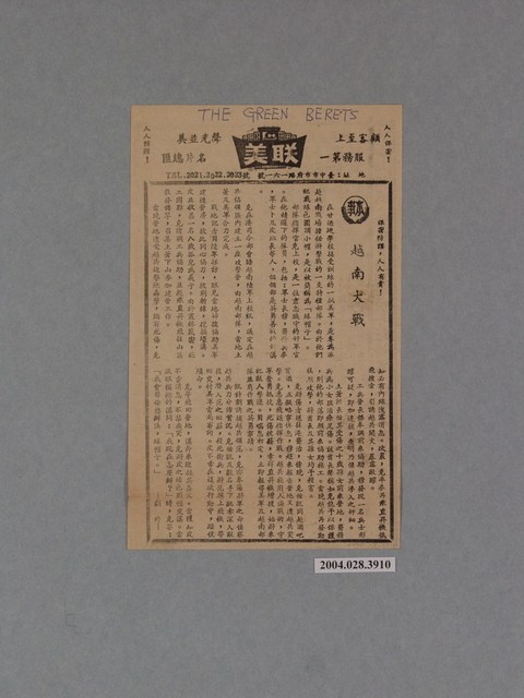 此物件是單張兩面,外觀保存良好,無破損情形,但物件因老舊圖片顏色有變淡的情形。 物件主要是《越南大戰》本事,此《越南大戰》本事是聯美戲院,地址是臺中市市府一六一號,TEL:2021,2022,2023號。是在講述在甘迺迪學校接受訓練的一批美軍,是專為派赴越南戰場擔任游擊戰的一支特種部隊。由於他們配戴綠色圓頂小帽,因此簡稱為「綠帽子」。此《越南大戰》本事則是在說「綠帽子」英勇事蹟的故事。 背面右半部是下期放映《愛的世界續集》電影宣傳單,世界名著改編義大利影壇偉大貢獻。左半部是近日放映《世界結婚奇譚》電影宣傳