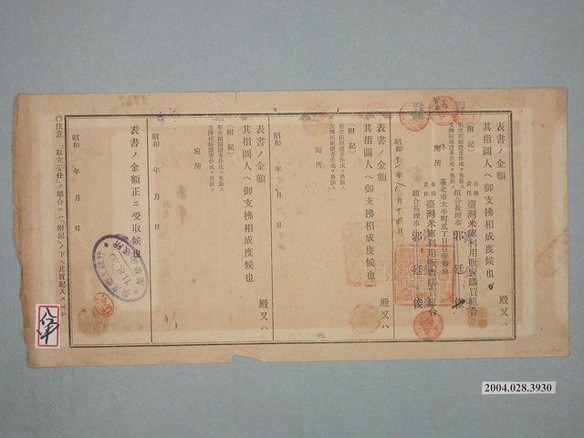 本件為昭和11年(1936)臺灣米庫利用販賣購買組合外匯帳單,由臺灣米庫利用販賣購買組合匯款640円予黃金生,支付期限為昭和11年8月20日,支付地點為臺北市萬華。在本件的背面,寫有金額匯兌的流程:款項於昭和11年8月20日轉入臺灣商業銀行萬華出張所。正面左下角貼印花稅票参錢。臺灣米庫利用販賣購買組合長理事原為郭廷俊,在姓名劃兩直線,在旁蓋章黃金生,表示郭廷俊改為黃金生。為替手形中譯為外匯帳單。