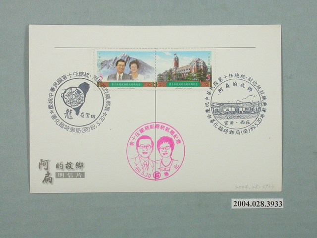 此物件為明信片,背景照片為臺南市官田區東西庄里惠安宮,為前總統陳水扁故鄉的地方廟宇。 此件文物的主角為陳水扁,1950年生於臺南縣官田鄉,歷任中華民國總統、臺北市市長、立法委員、臺北市議員。1980年2月,美麗島事件諸多要角被警備總部以叛亂罪起訴,陳水扁做為辯護律師團成員,為黃信介辯護,而後踏入政壇。解嚴前後擔任民意代表的陳水扁素以問政犀利聞名,他在1994年代表民主進步黨當選臺北市市長,繼於2000年當選中華民國總統,實現中華民國首度的政黨輪替。卸任總統後,陳水扁面臨多項司法起訴,於2008年11月遭羈押,而後於2015年獲准保外就醫。 此物件為臺灣2000年的第10任總統選舉相關商品,此次選舉為臺灣自1996年後第二次由全民直接參與投票的總統、副總統選舉。此次選舉中,中國國民黨的代表為連戰、蕭萬長,民主進步黨的代表為陳水扁、呂秀蓮,另有從國民黨脫黨參選的宋楚瑜、張昭雄,從民進黨脫黨參選的許信良、朱惠良,新黨也於此次選舉派出李敖、馮滬祥參選,此次選舉陳水扁及呂秀蓮當選,造成臺灣歷史上第一次的政黨輪替。