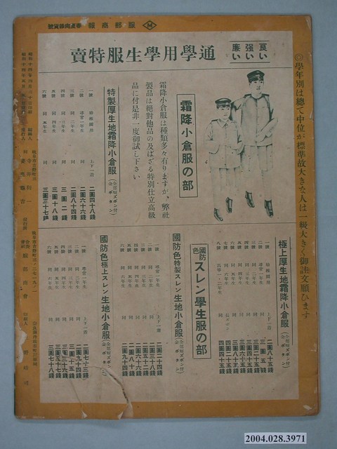 本物件為服部商報,由合資會社服部商會於昭和14年5月5日發行,該商會位於岐阜市。該商報內有諸多衣服、褲子、鞋子與領帶等服飾型錄,涵蓋男女老幼,另有雨傘、雨衣、鋼筆等物。