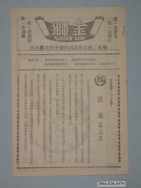 1.臺北金獅戲院1980年代提供觀眾的電影本事,雙面印刷。一面是美國片《洛基第三集》的電影本事,該片是1982年由席維斯史特龍自編自導自演的拳擊片。另面則是下期放映的法國片《摩登情郎》廣告及劇照,該片由為法國金獎笑匠皮爾李察主演,傑勒爾伍利、華拉麗等共同演出的爆笑喜劇電影。